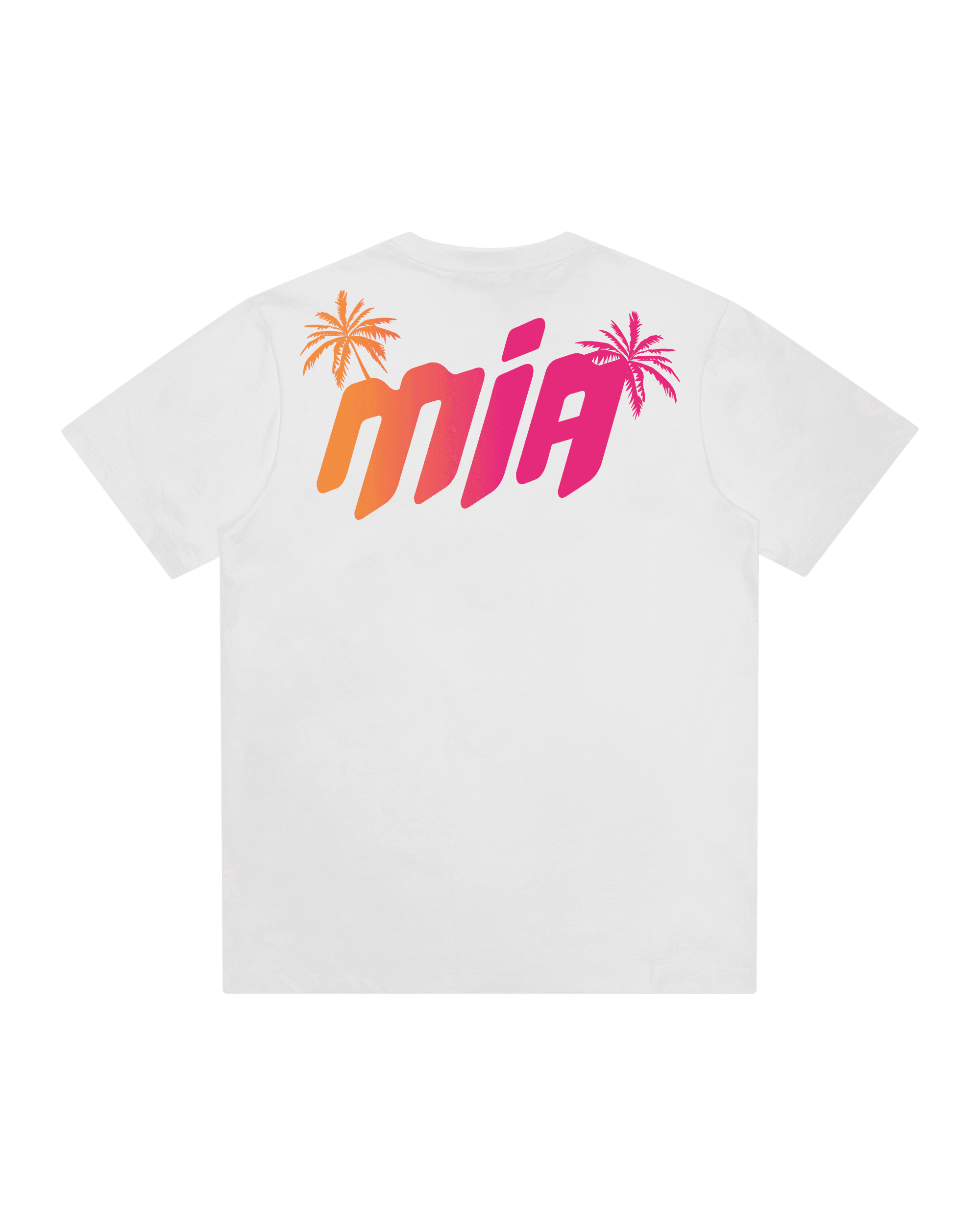 Tee featuring a gradient silk screenprint with original artwork inspired by Miami at front and back.
