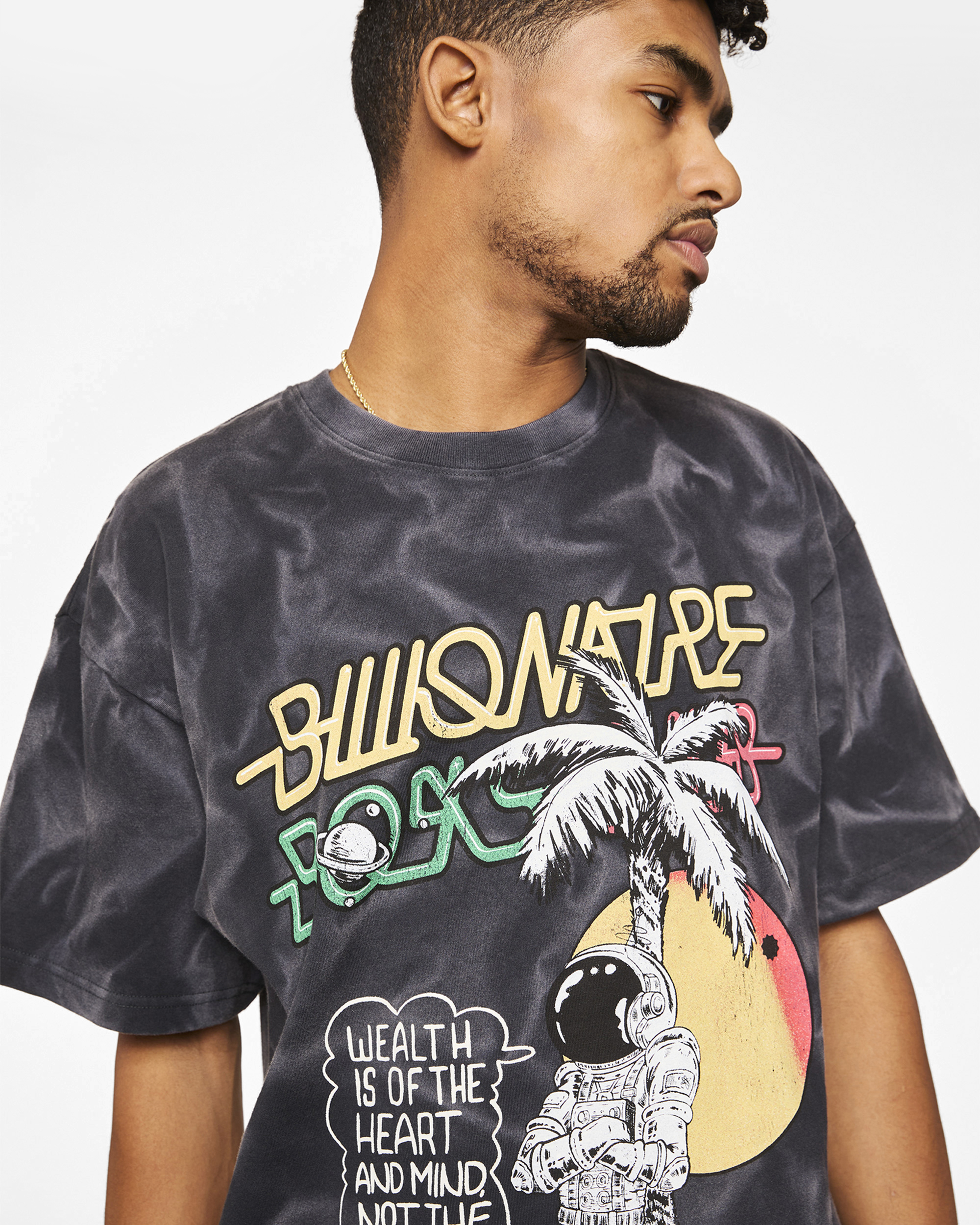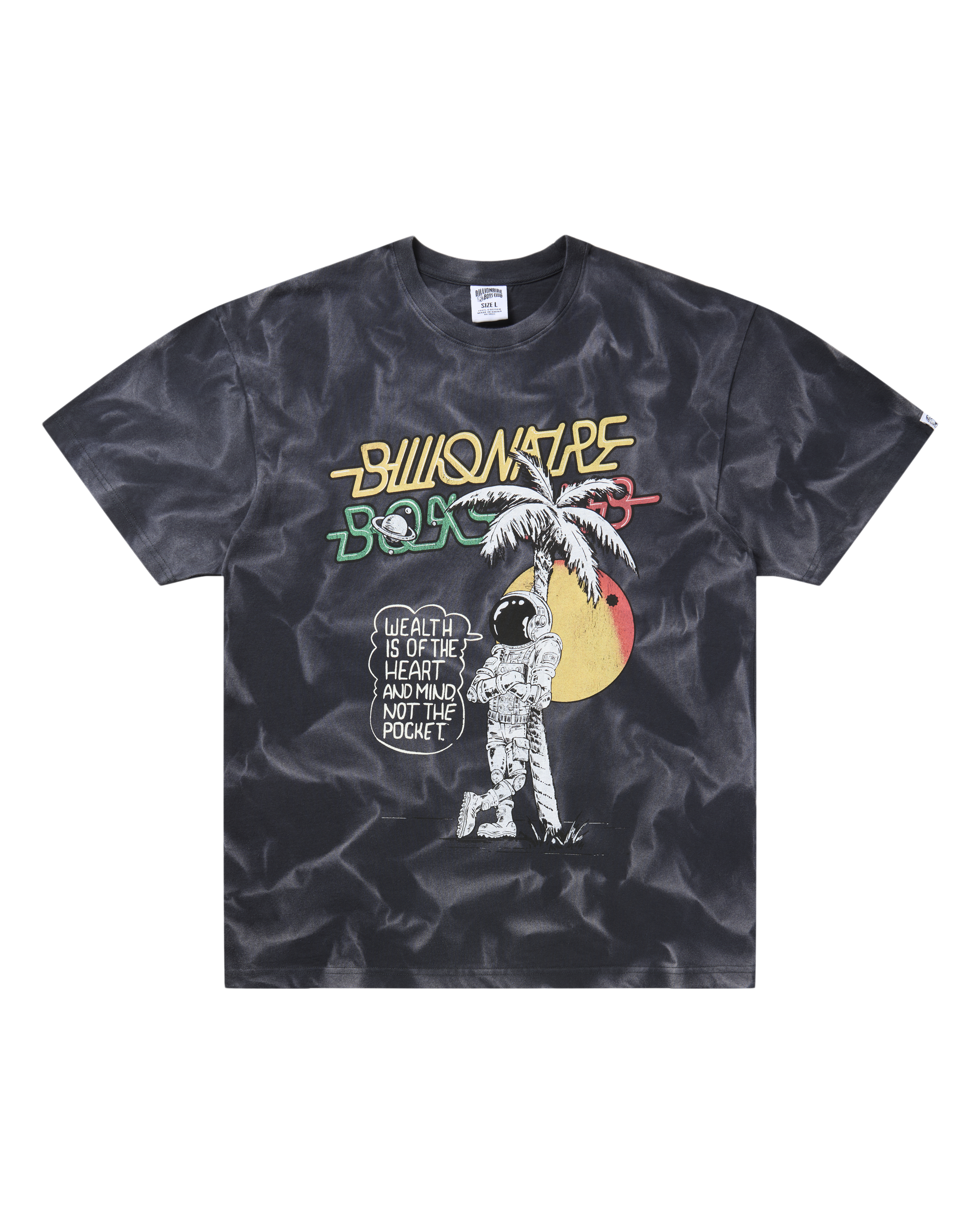 The Chill Tee displays a tropical-themed graphic and the mantra on the front. with the Standing Astronaut printed at the back of the neck.