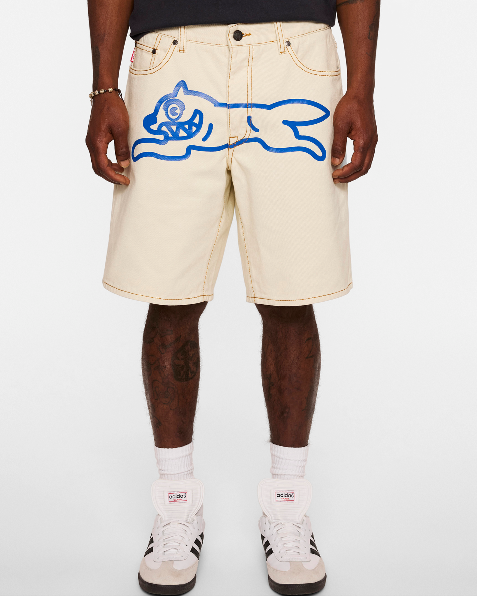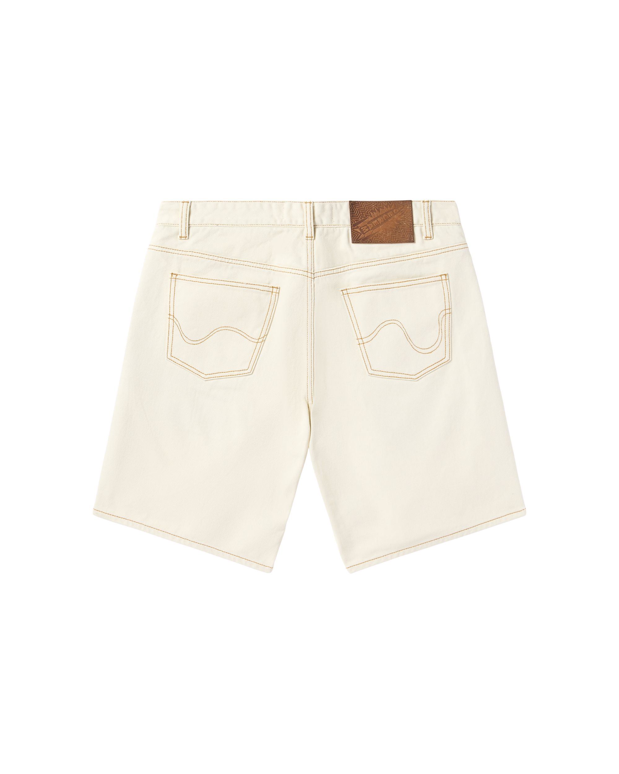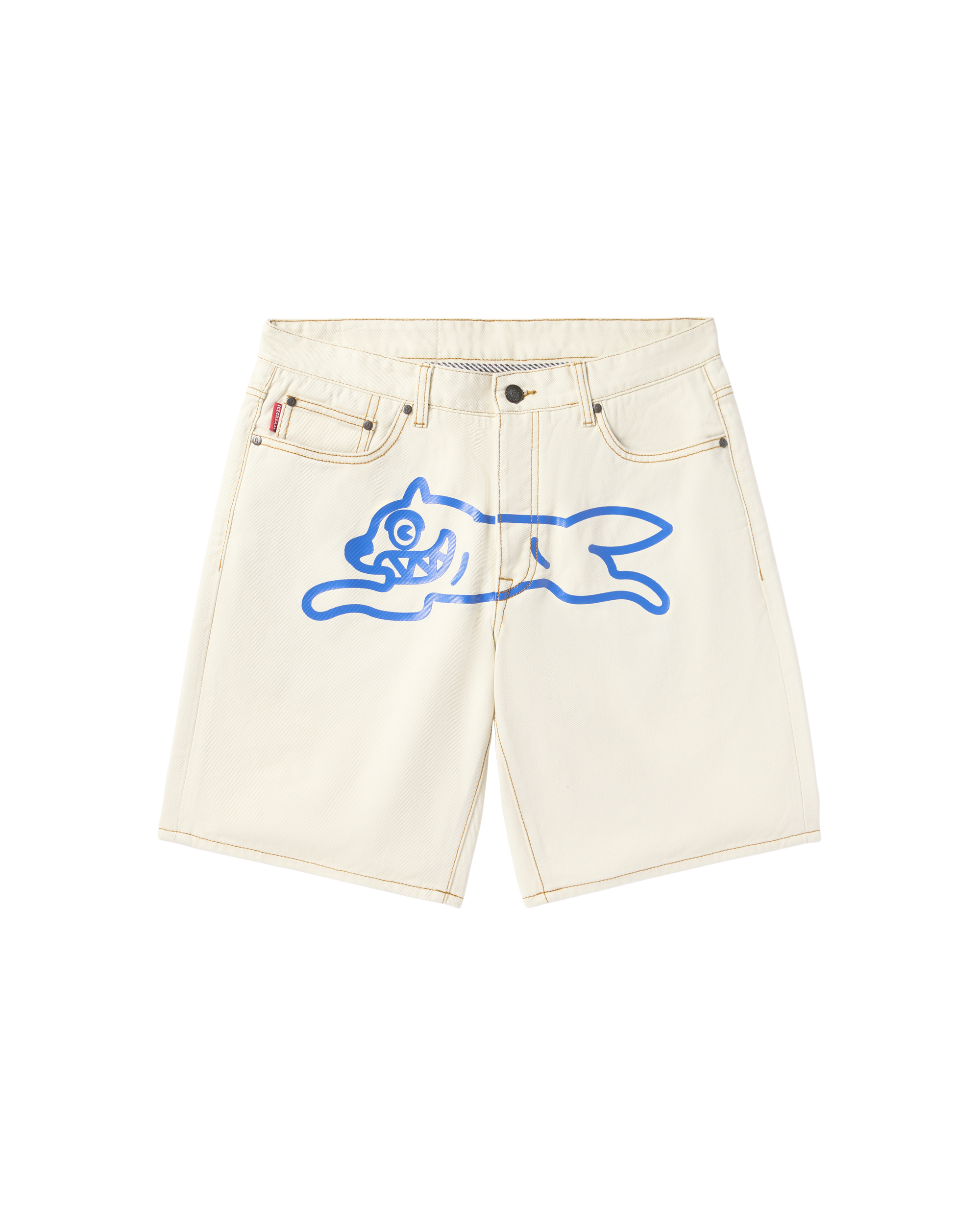 Jean shorts featuring the Running Dog graphic positioned at the front. complemented by distinctive drip stitch accents on the rear pockets.