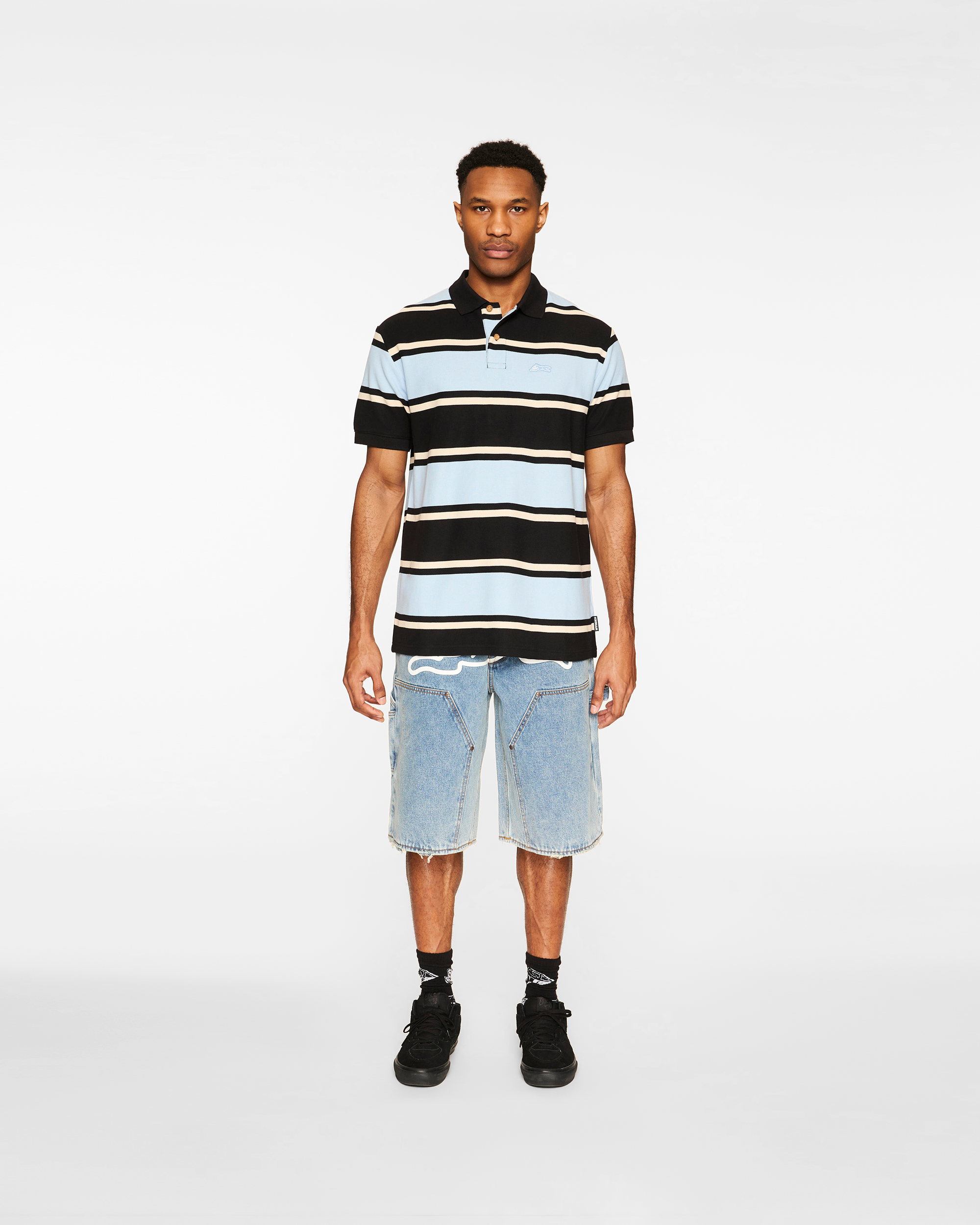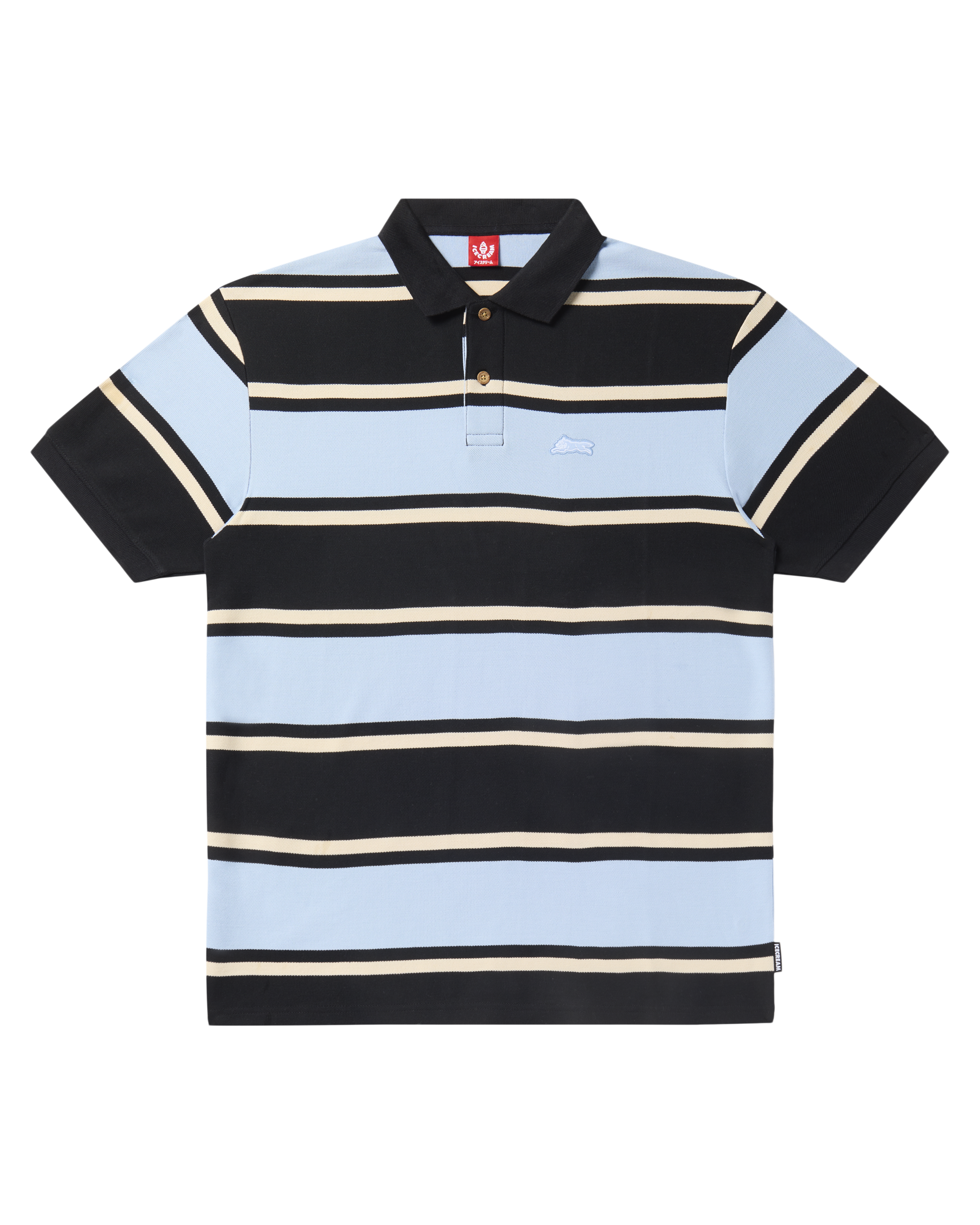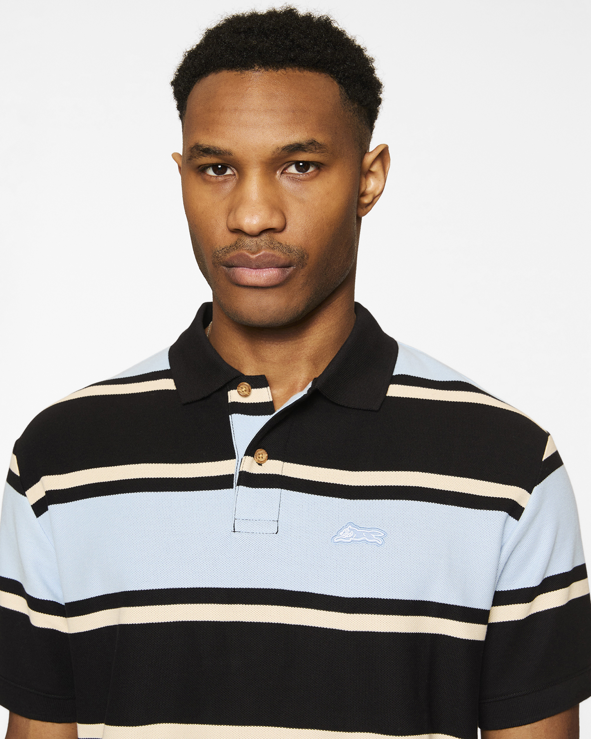 The Horizon Polo features a stripe pattern and a Running Dog woven label on the front left chest.