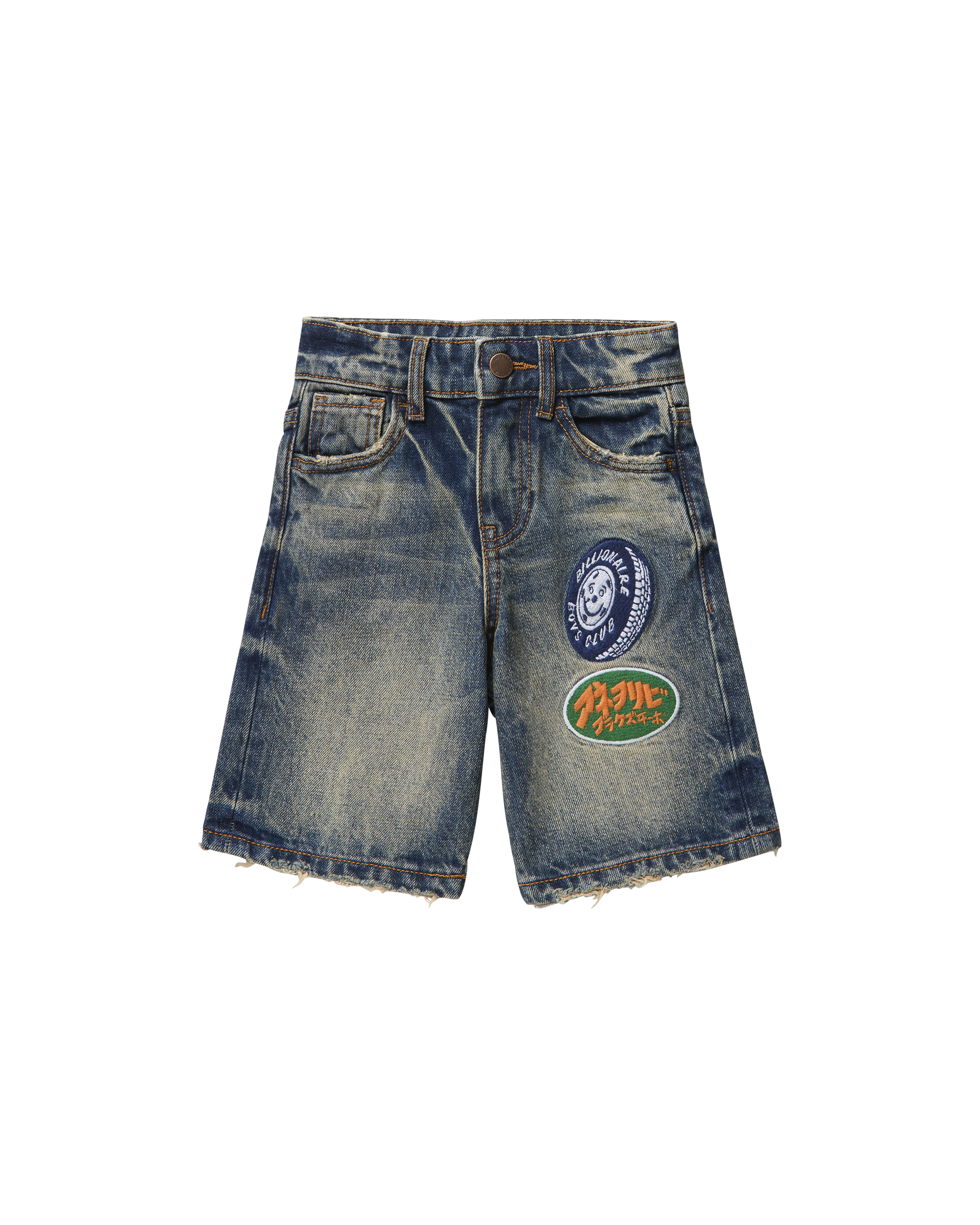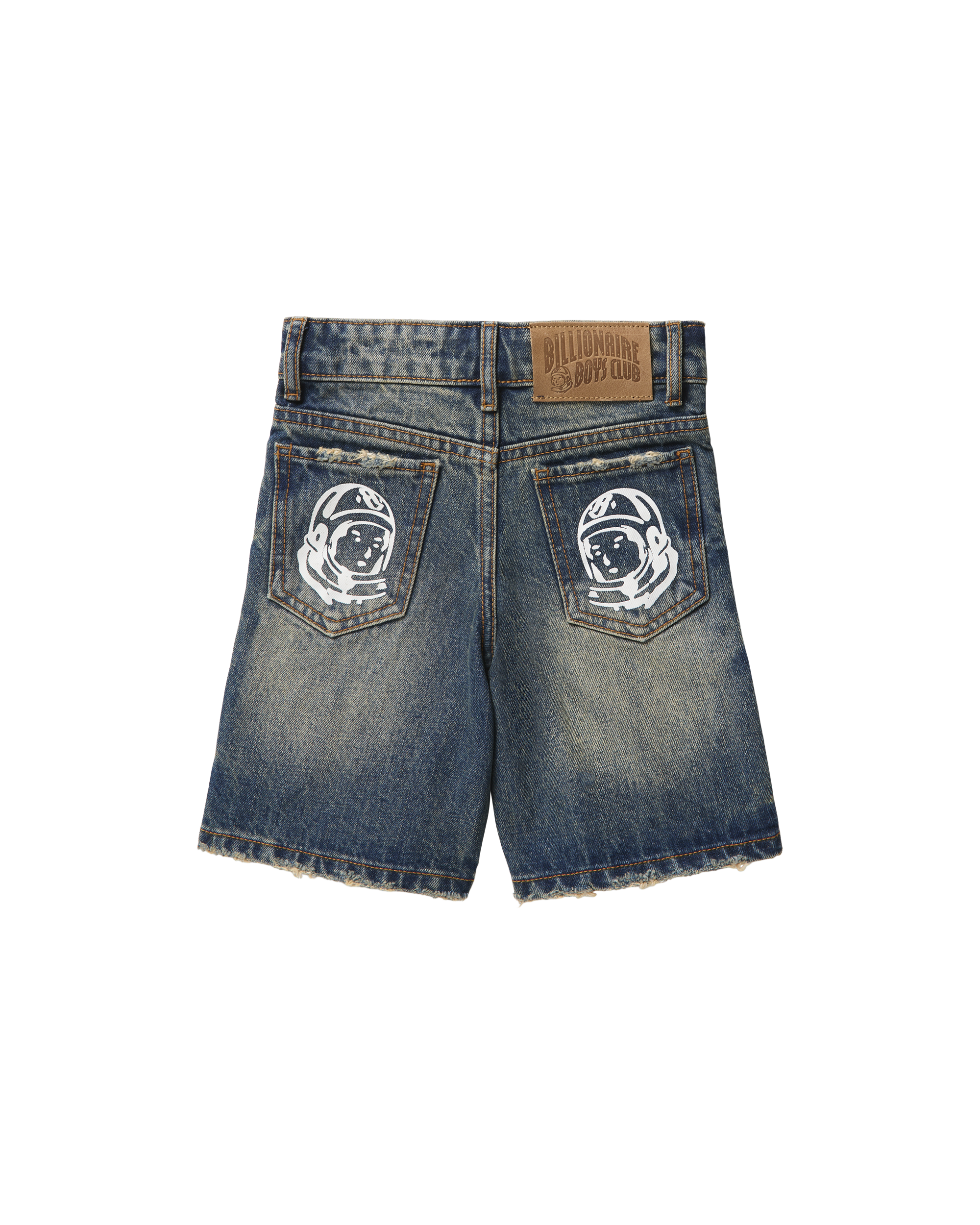 The Gears Jean Shorts feature woven patches on the front and the Helmet Head logo printed on the back pockets.