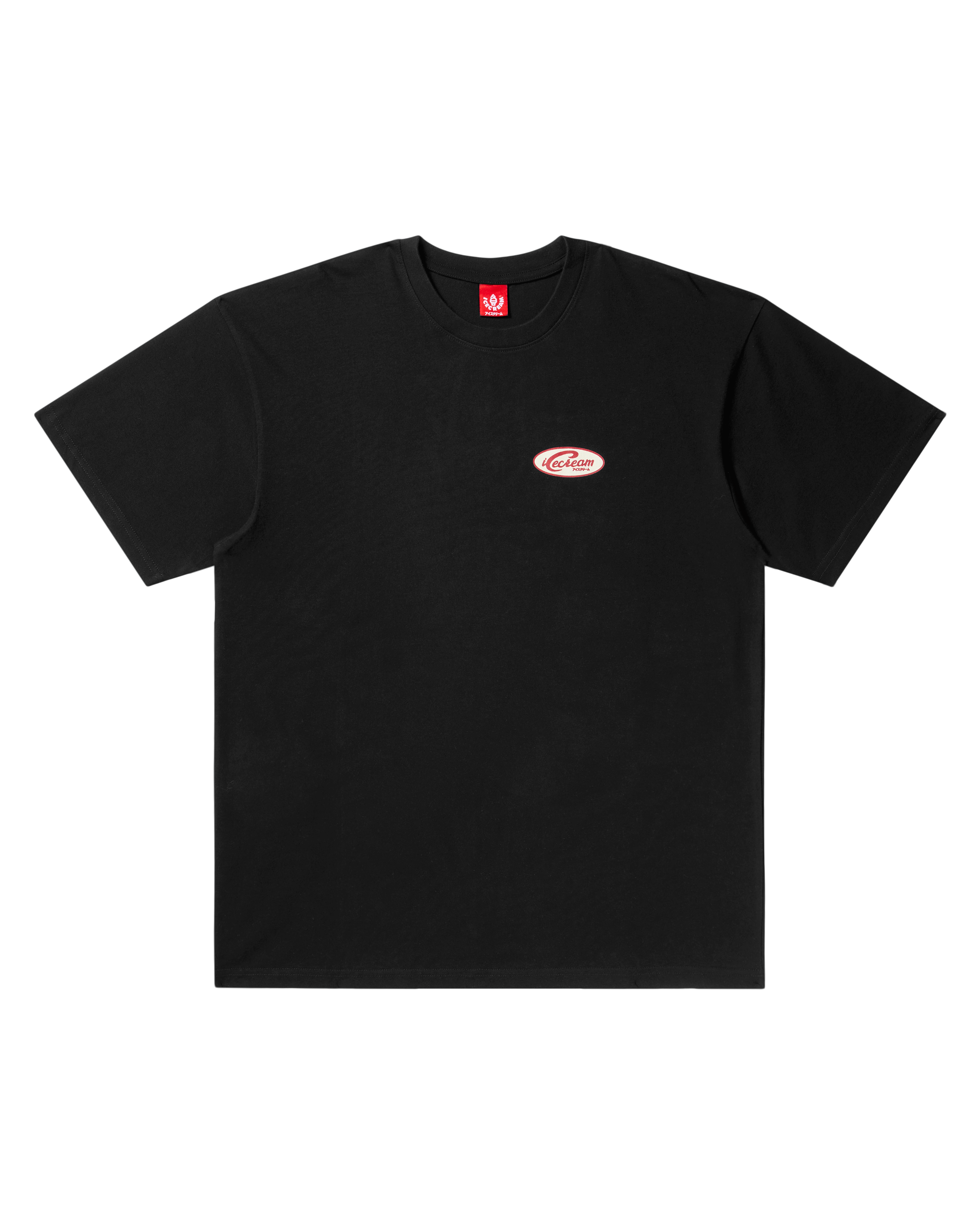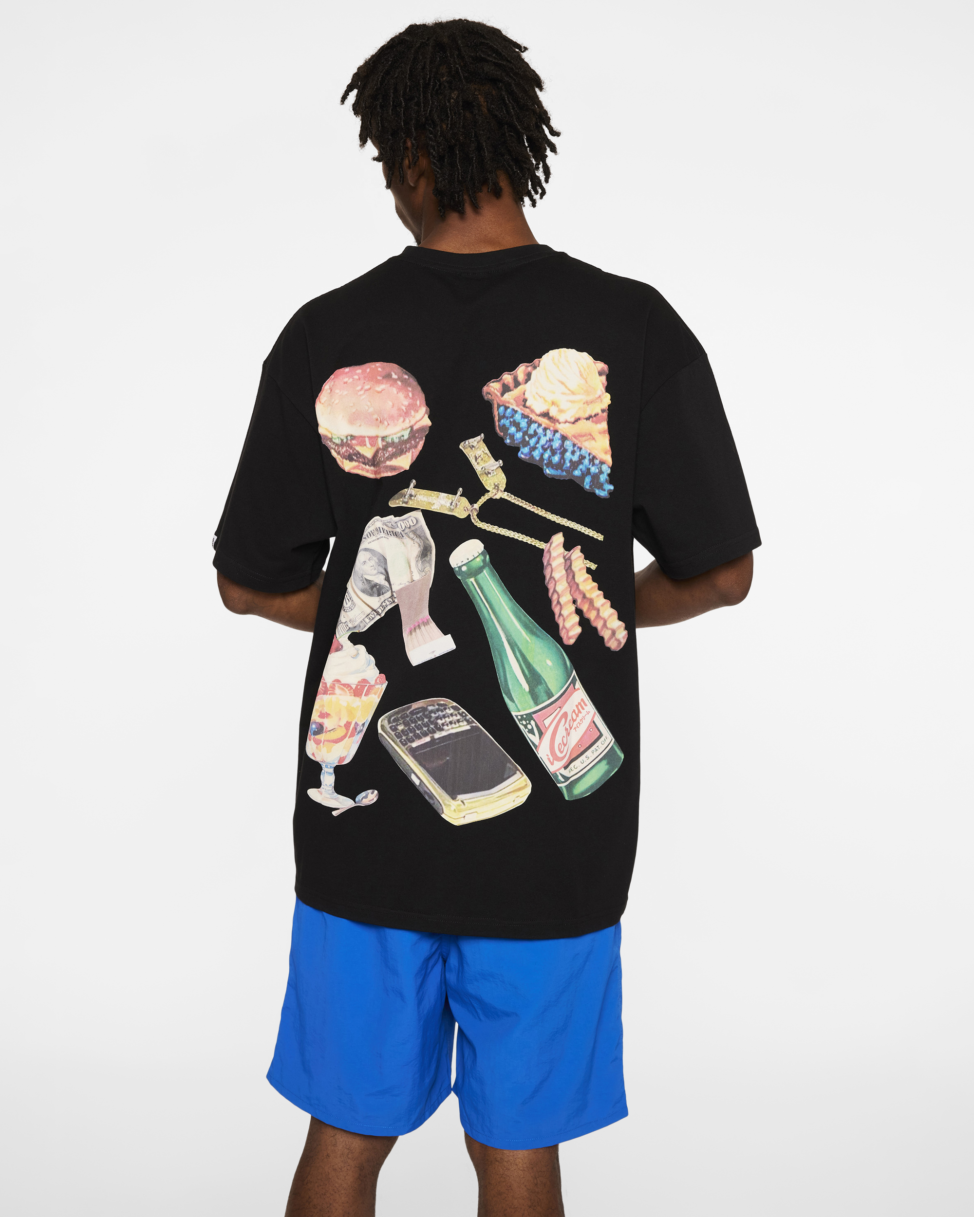 T-shirt featuring the ICECREAM logo on the front left chest. complemented by a vibrant collage of assorted foods displayed on the back.
