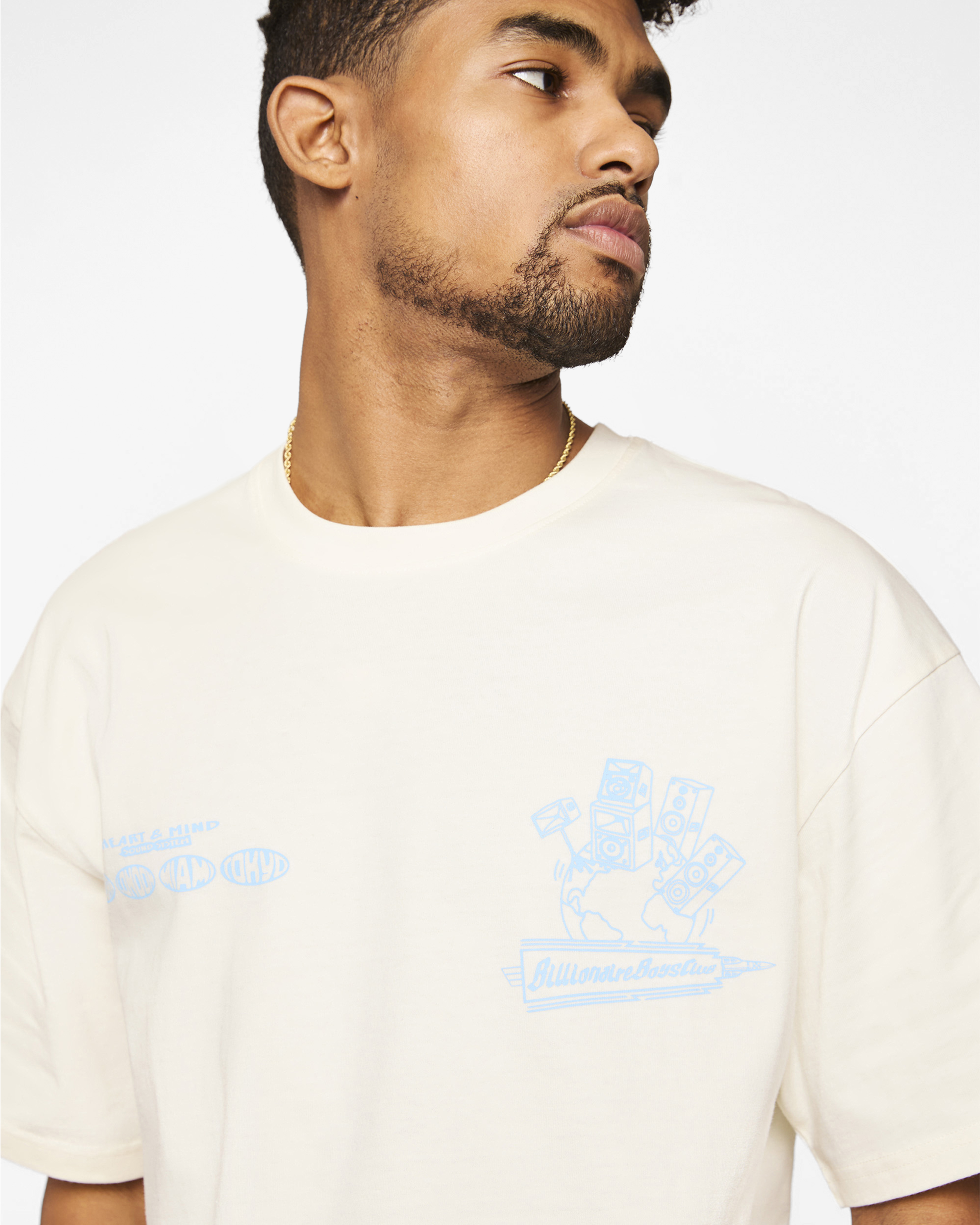 The Sound Waves Tee displays a Billionaire Boys Club graphic on the left front. city names on the right. and a globe with stereos printed on the back.