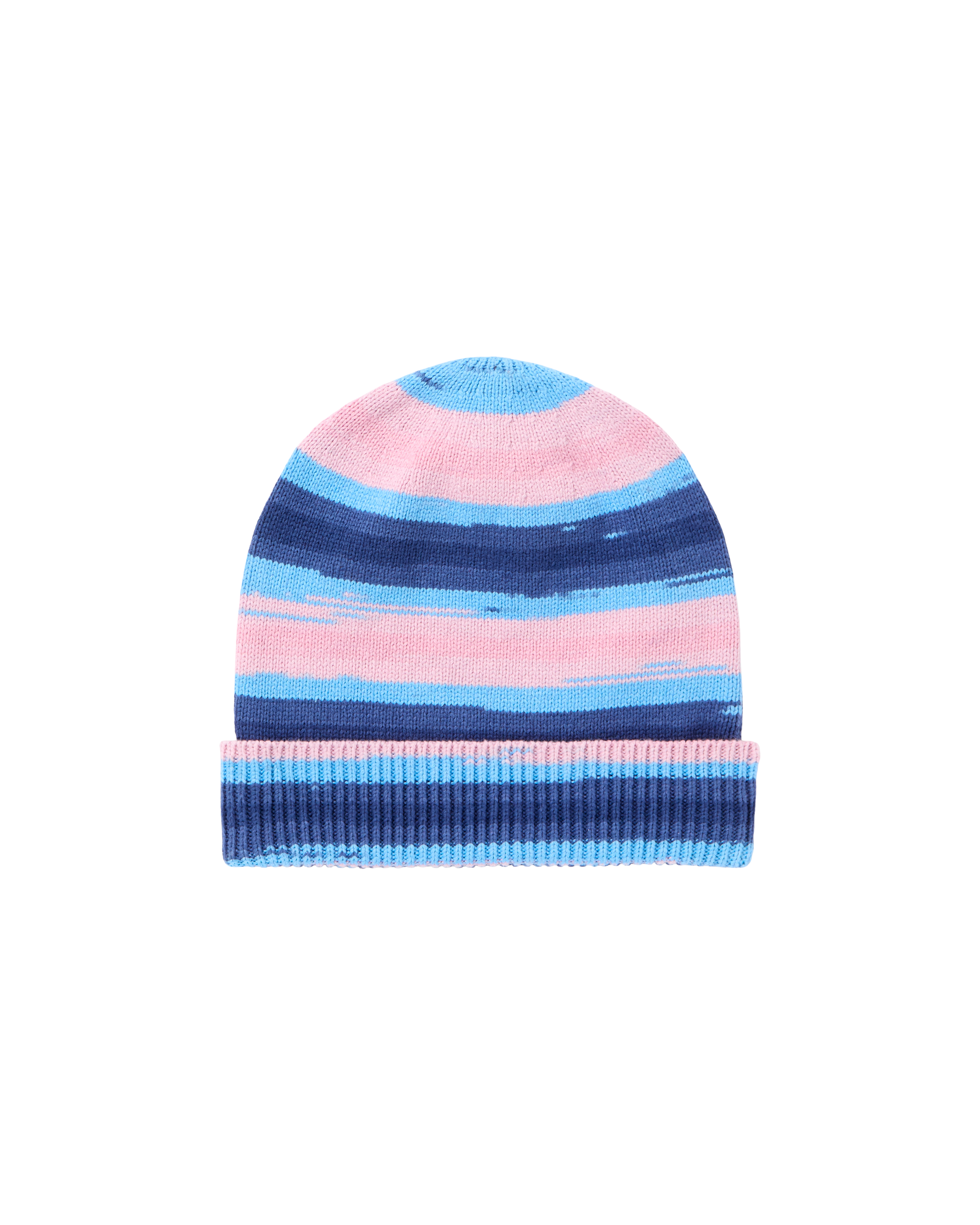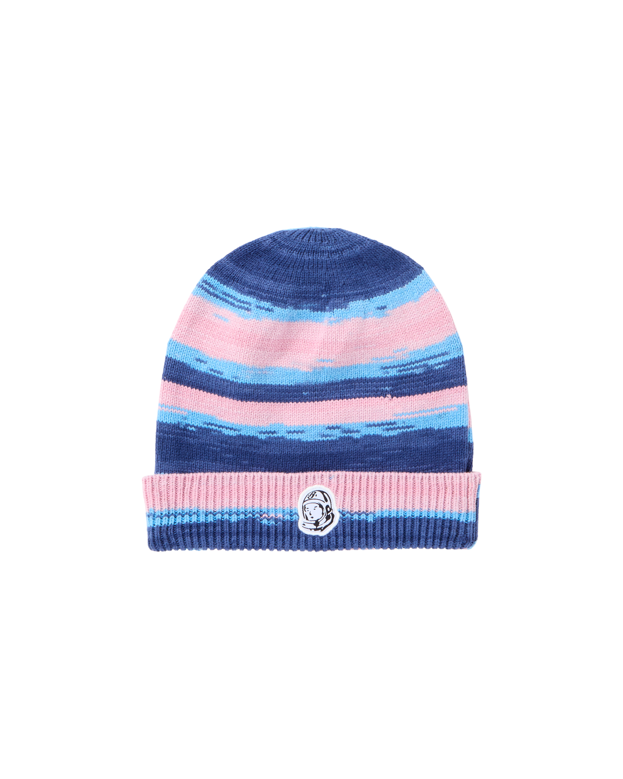 Knit beanie designed with multicolor horizontal stripes and a woven Astronaut logo patch at the cuff.